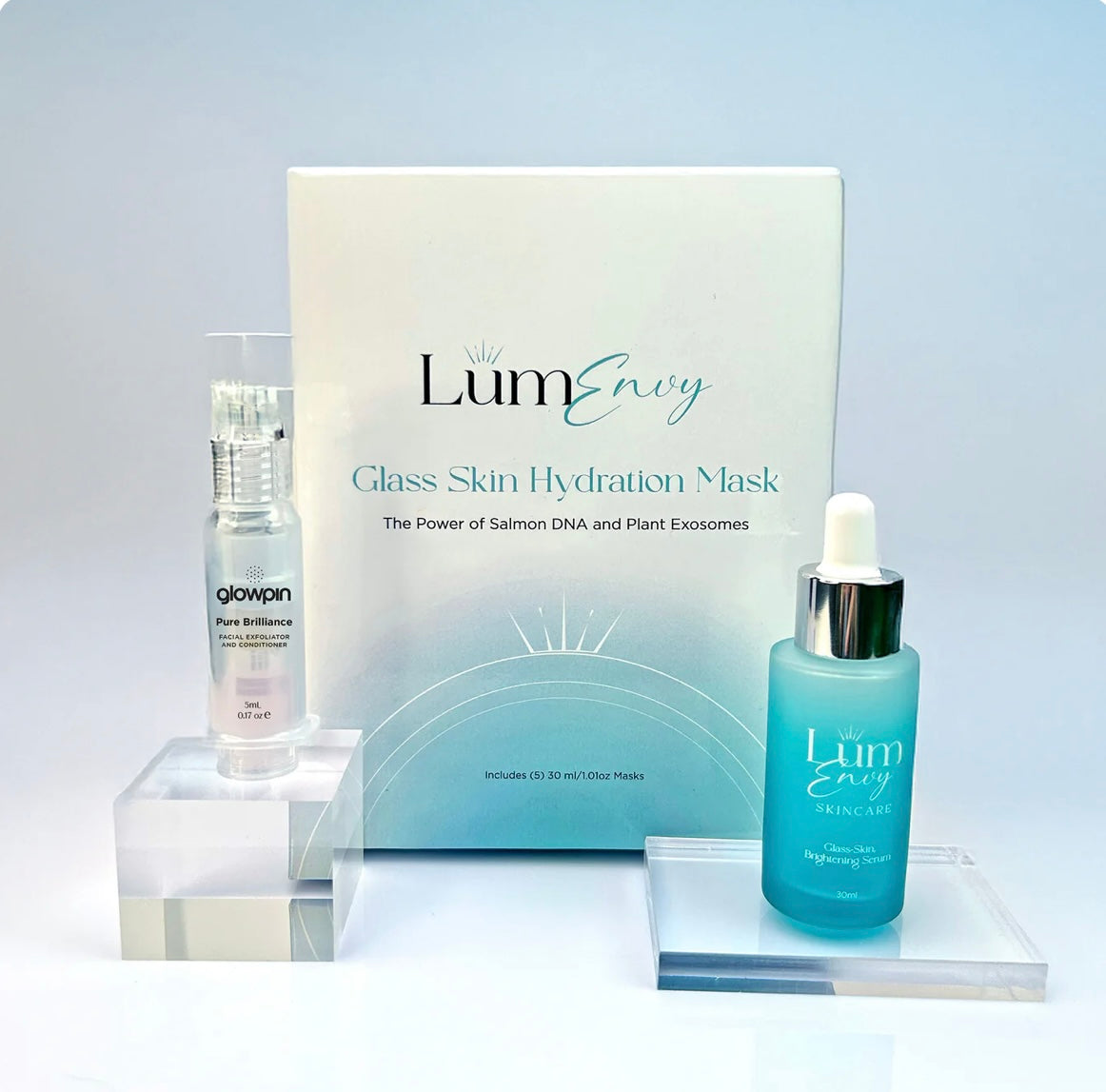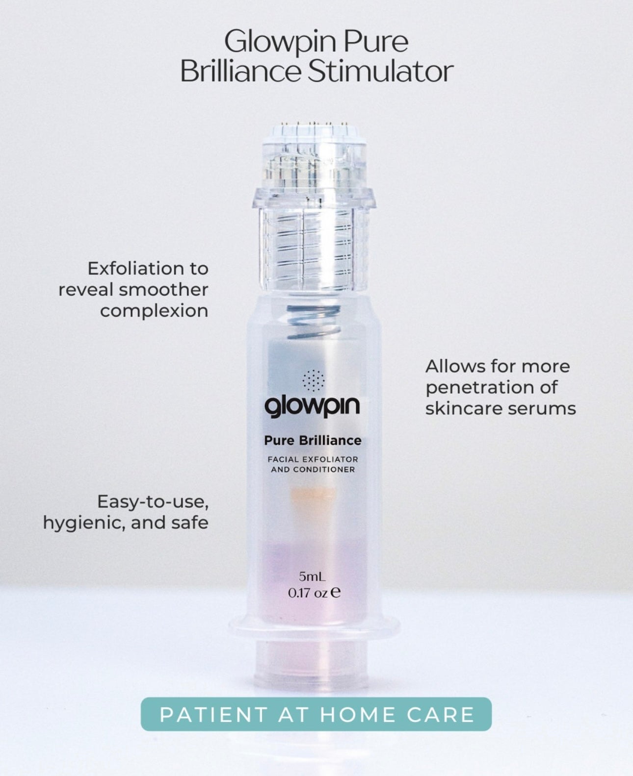 At the heart of the bundle is the Glowpin Pure Brilliance Micro-Infuser. Each stamp exfoliates and gently creates small microchannels that allow our potent infusion of key ingredients: Hyaluronic Acid, Niacinamide, PDRN (Salmon DNA), B Vitamins, and Essential Amino Acids for real, visible results to condition and brighten the skin.